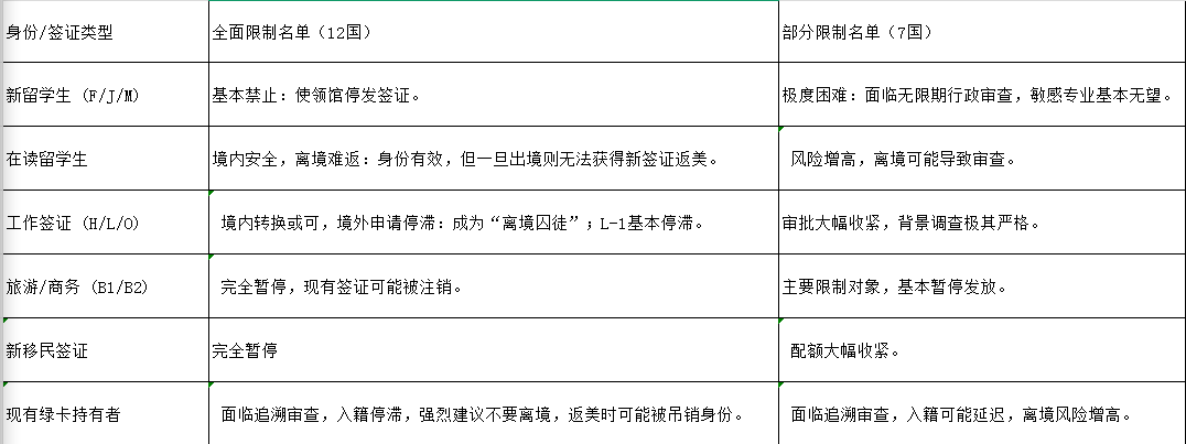 针对以下7个国家,美国将主要暂停旅游、商务及部分特定类别的工作签证,同时大幅收紧移民签证的审批配额: